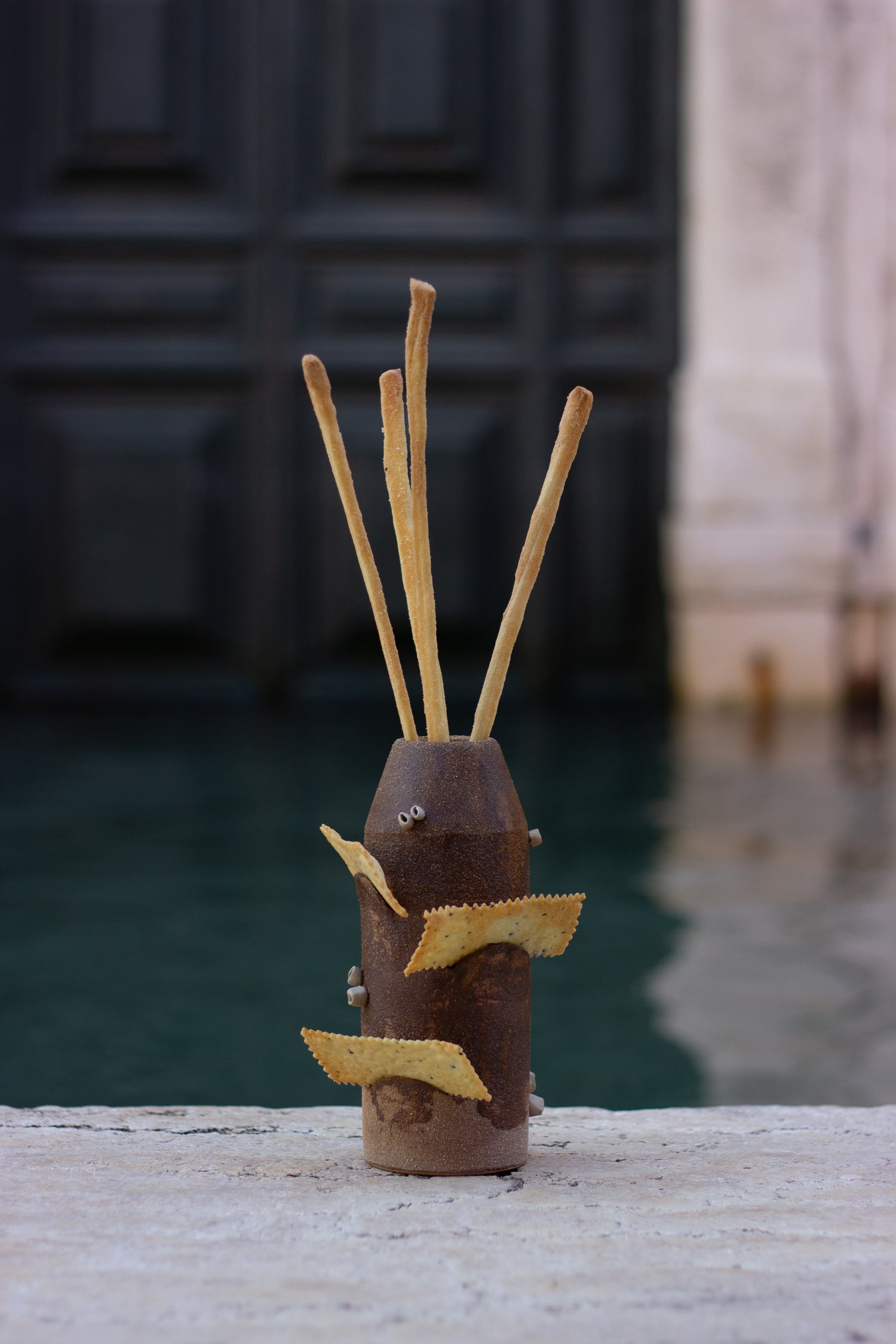 Immagine - porta grissini creato con l'argilla di laguna per Il ristorante Wisteria a Venezia che rimanda alle bricole.