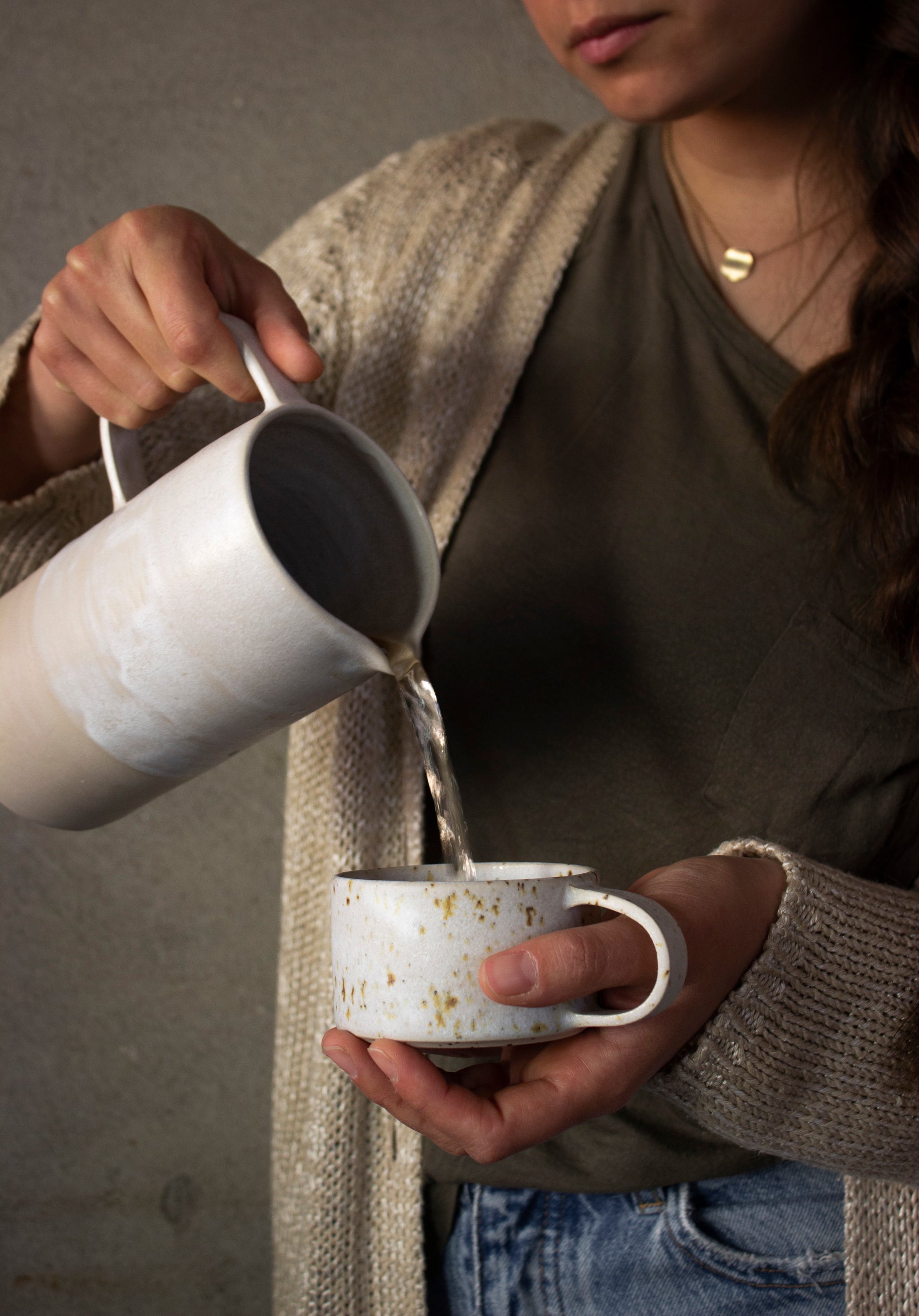 Realizzata al tornio con un’argilla puntinata e rifinita con uno smalto bianco satinato.