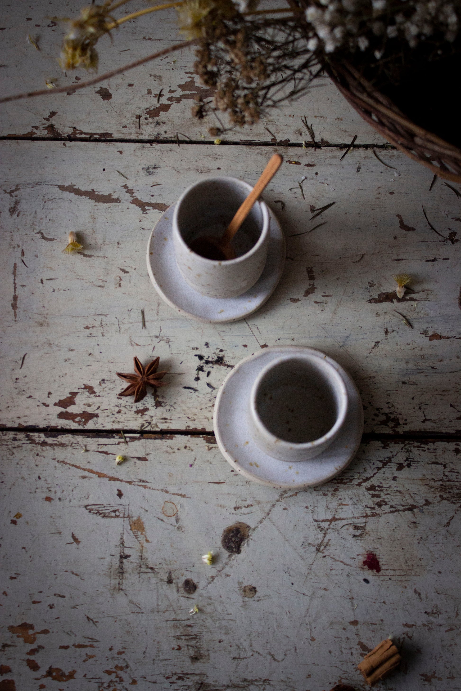 Realizzata al tornio con un’argilla puntinata e rifinita con uno smalto verde opaco. Perfetta per un caffè macchiato o la vostra grappa preferita.
