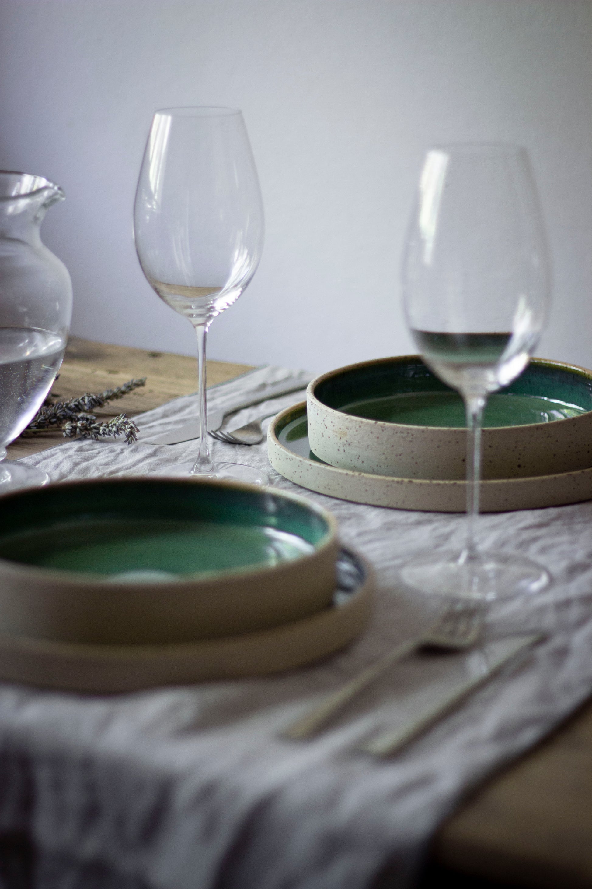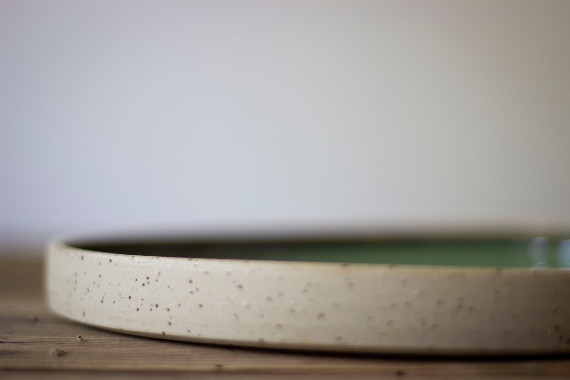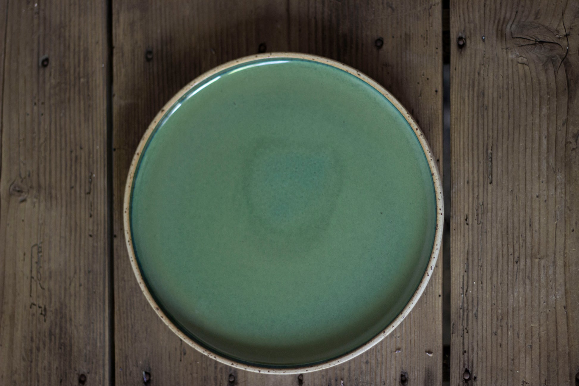 Realizzato al tornio con un'argilla puntinata color crema e rifinito con uno smalto verde brillante. Il set si compone di un piatto fondo e un piano per commensale. Se desideri arricchire il set con piattini dolce e ciotole per la zuppa o altri elementi, non esitare a contattarmi.