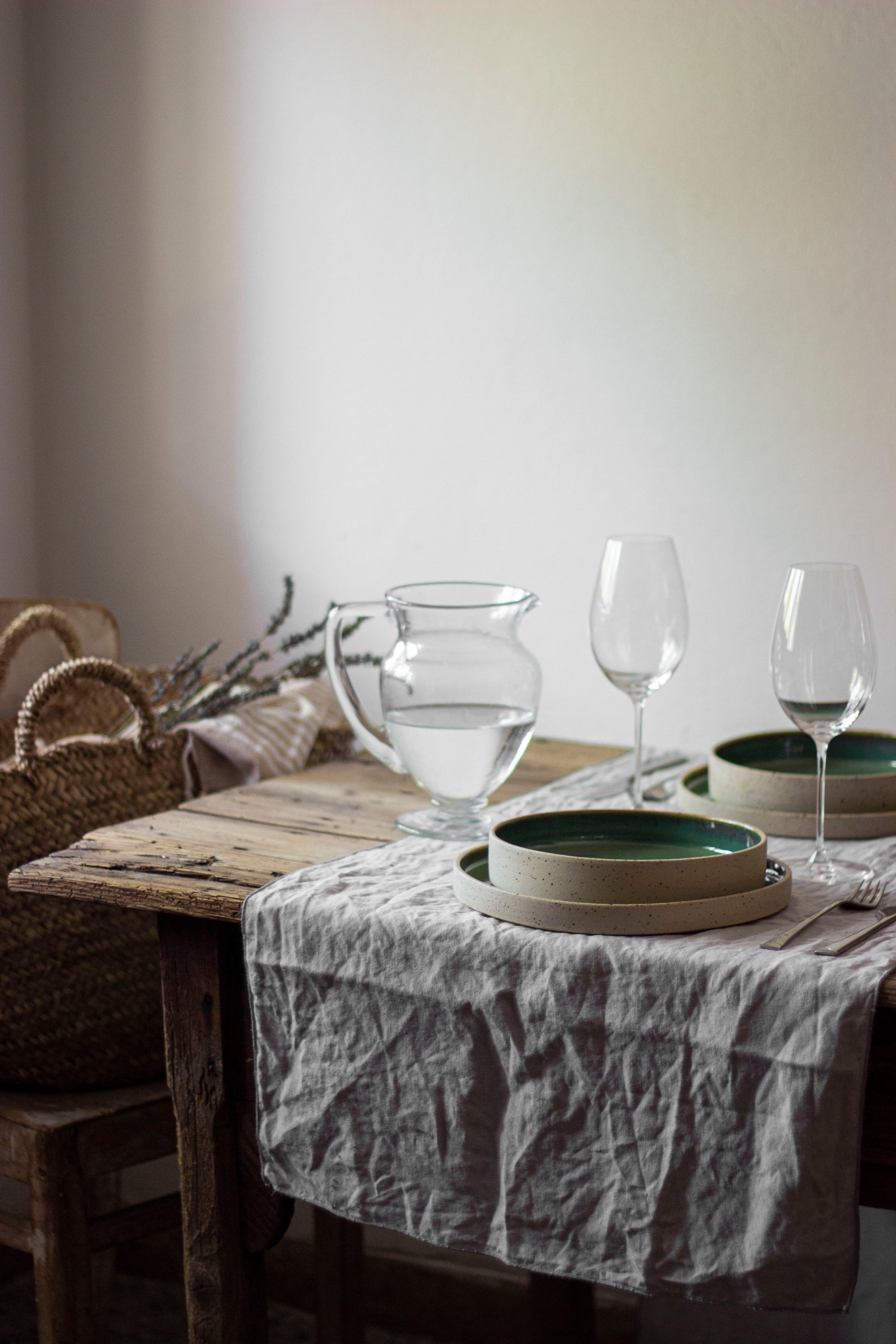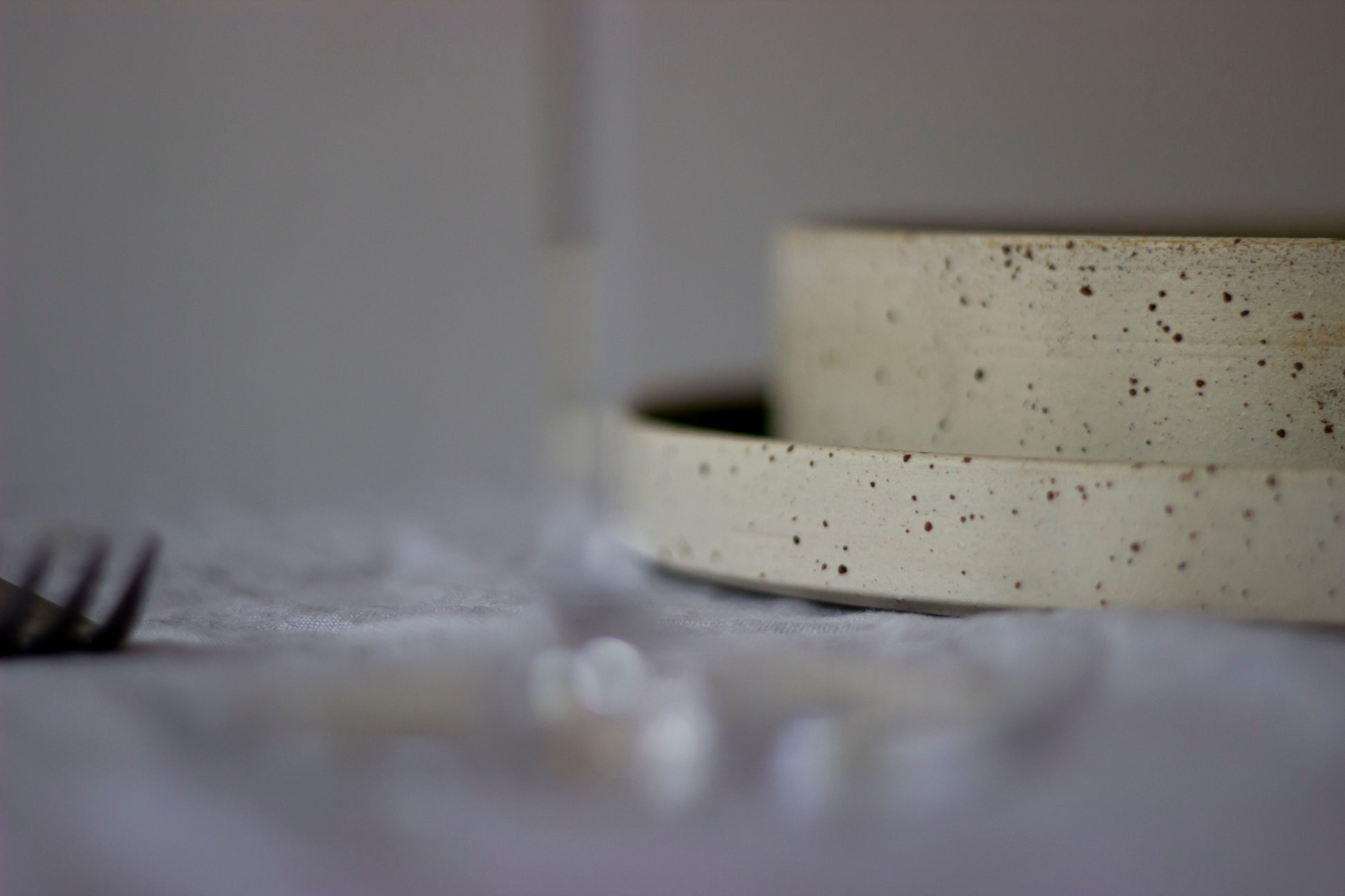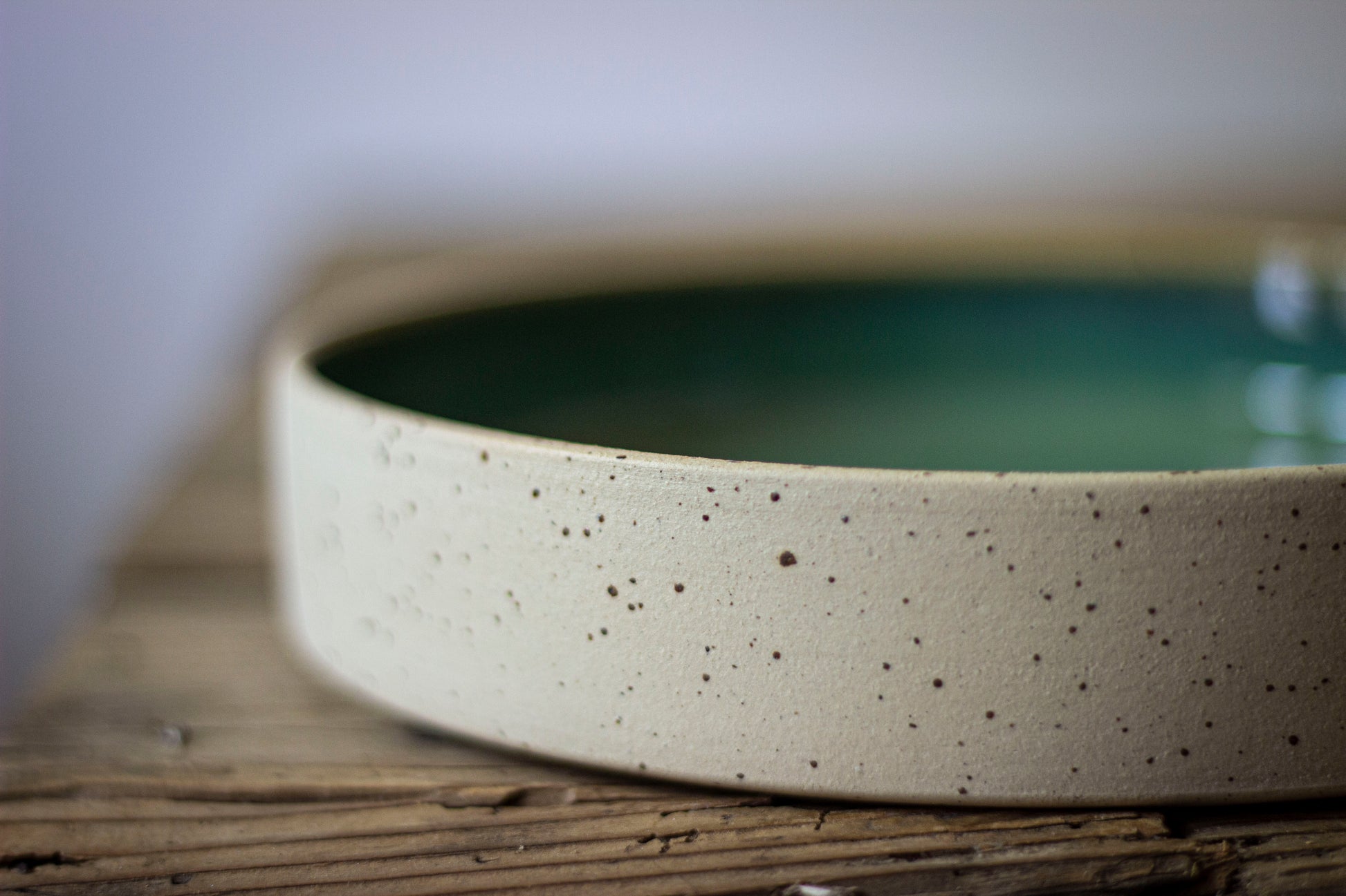 Realizzato al tornio con un'argilla puntinata color crema e rifinito con uno smalto verde brillante. Il set si compone di un piatto fondo e un piano per commensale. Se desideri arricchire il set con piattini dolce e ciotole per la zuppa o altri elementi, non esitare a contattarmi.