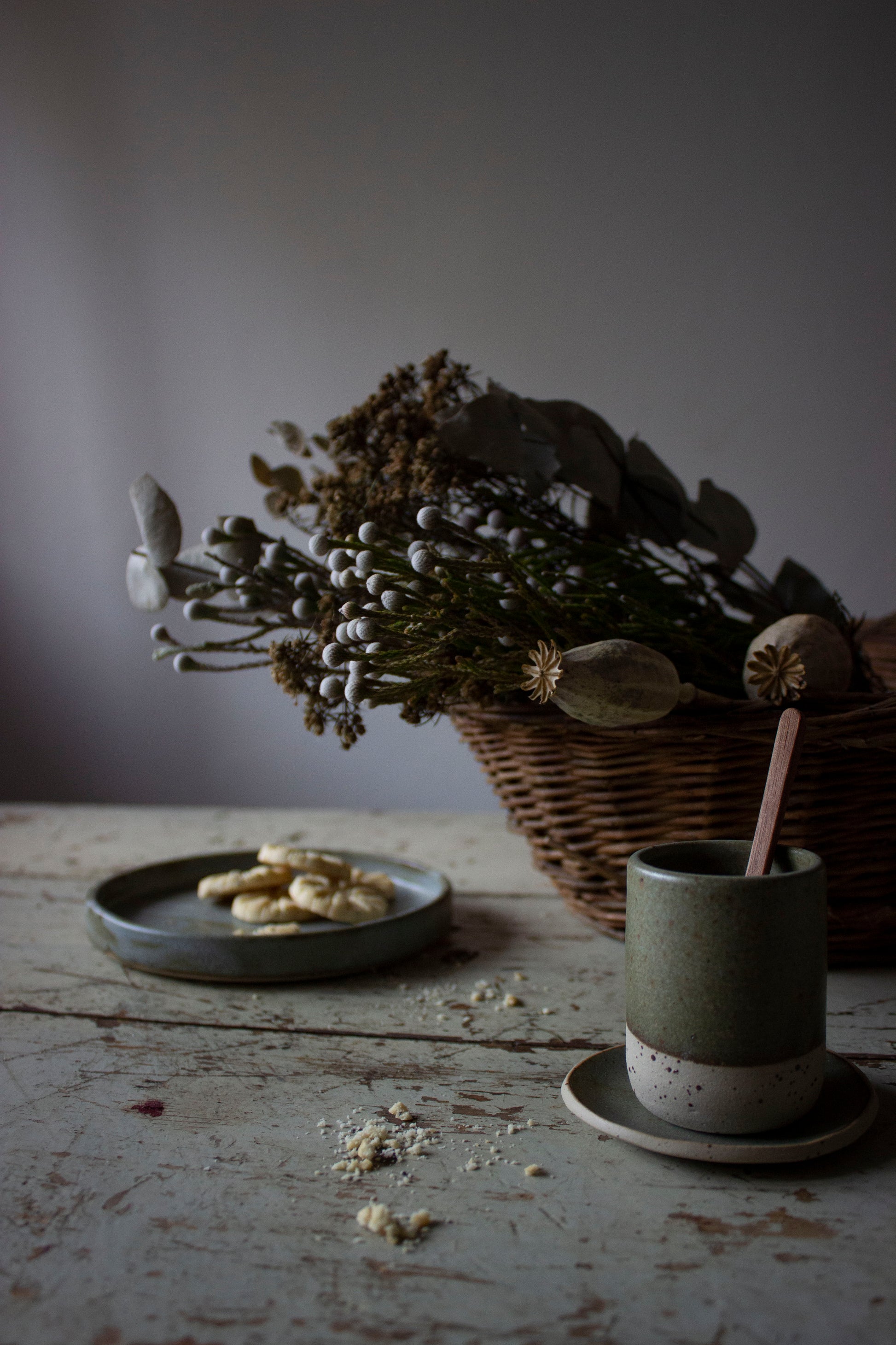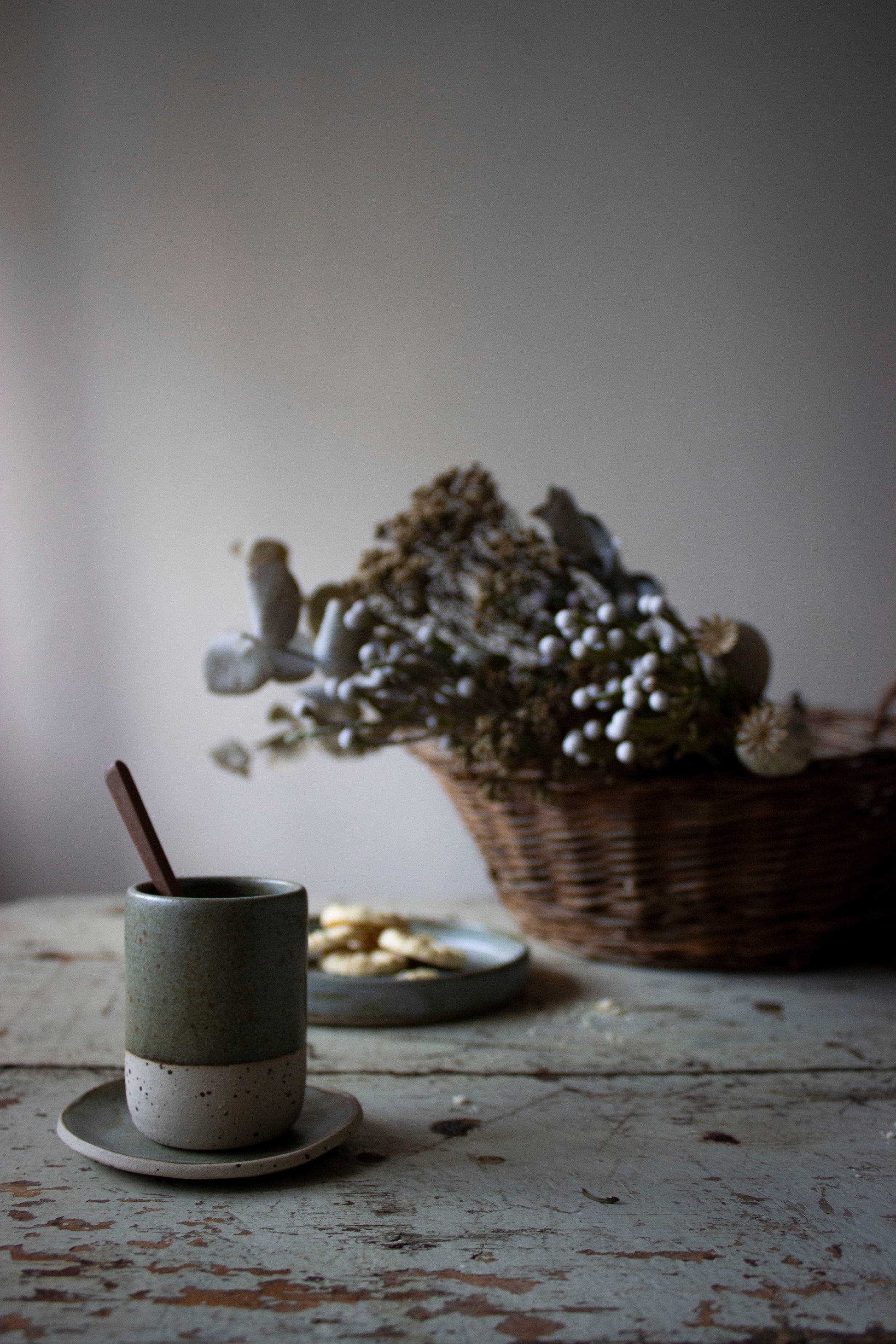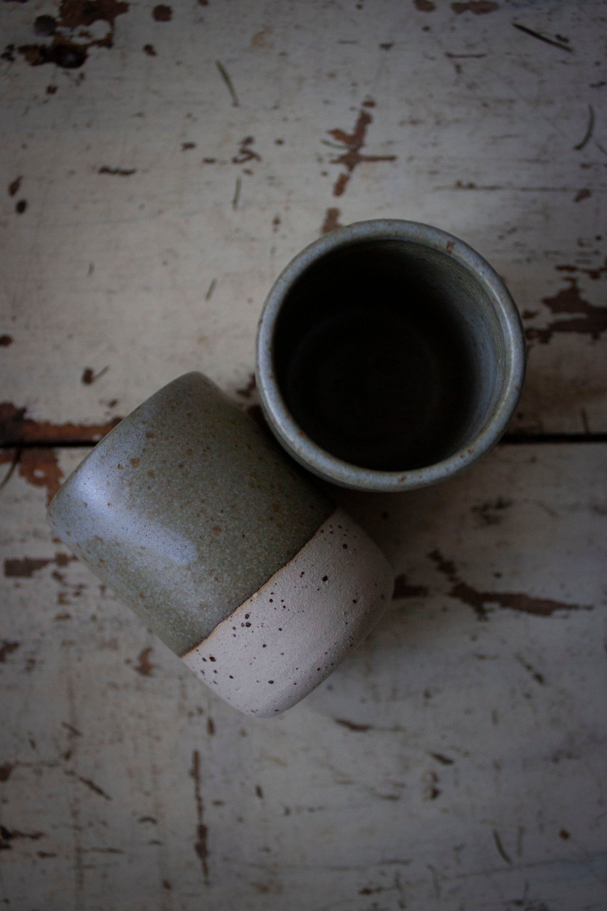 Realizzata al tornio con un’argilla puntinata e rifinita con uno smalto verde opaco. Perfetta per un caffè macchiato o la vostra grappa preferita.