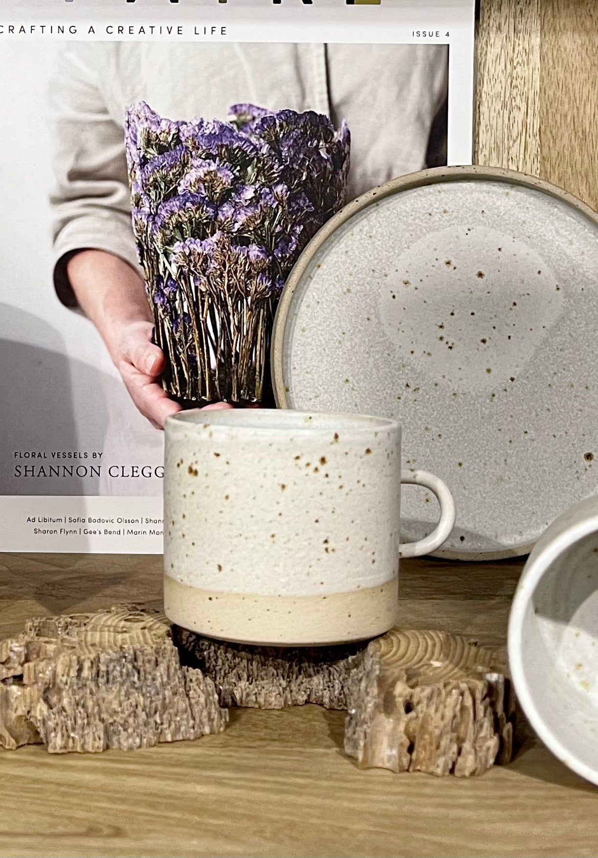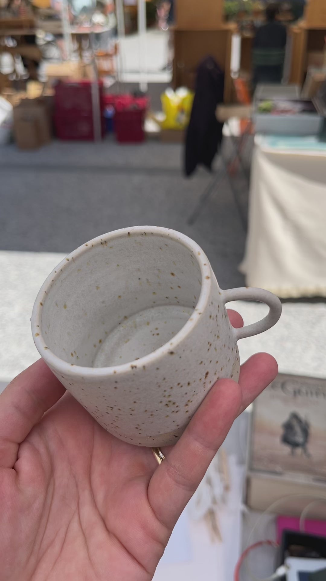 Realizzata al tornio con un’argilla color crema puntinata e rifinita con uno smalto bianco satinato. Come misura è perfetta per una moka da uno o per un caffè macchiato, ideale per accompagnarvi nel vostro rituale quotidiano, da soli o in compagnia.