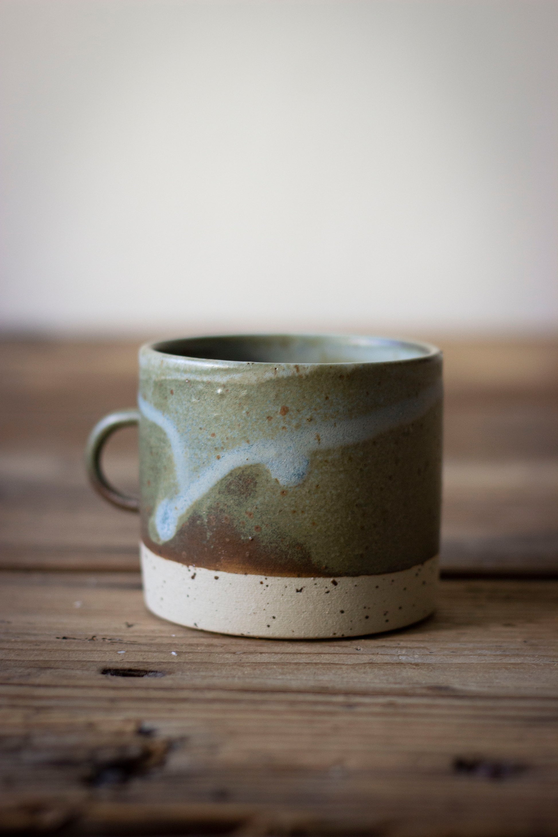 Tornita a mano con una terra puntinata color crema e rifinita con uno smalto verde opaco. Come misura è perfetta per una moka da uno o per un caffè macchiato, ideale per accompagnarvi nel vostro rituale quotidiano, da soli o in compagnia.