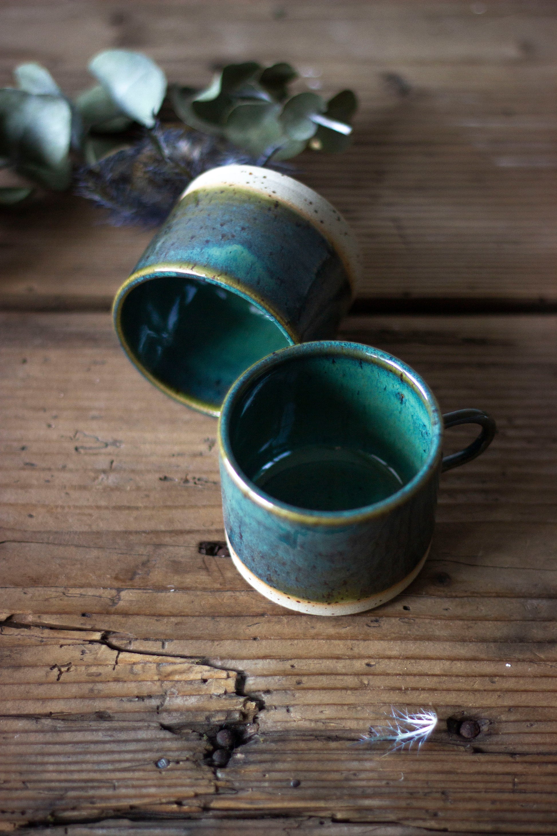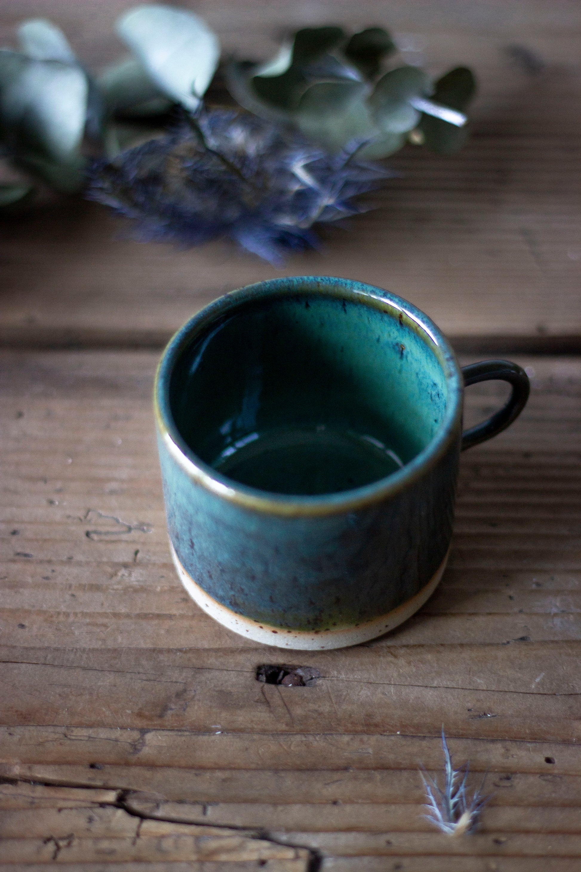 Tornita a mano con una terra puntinata color crema e rifinita con uno smalto verde brillante. Come misura è perfetta per una moka da uno o per un caffè macchiato, ideale per accompagnarvi nel vostro rituale quotidiano, da soli o in compagnia.