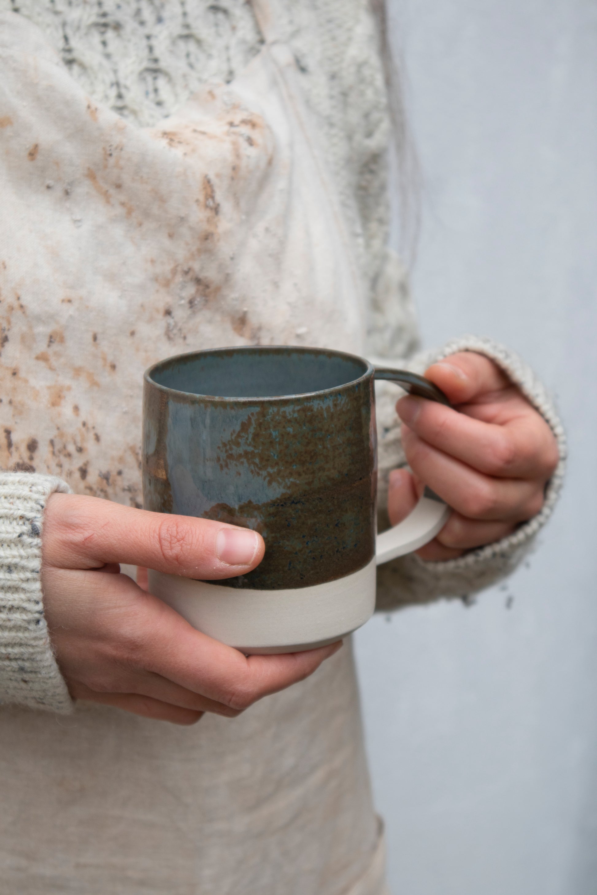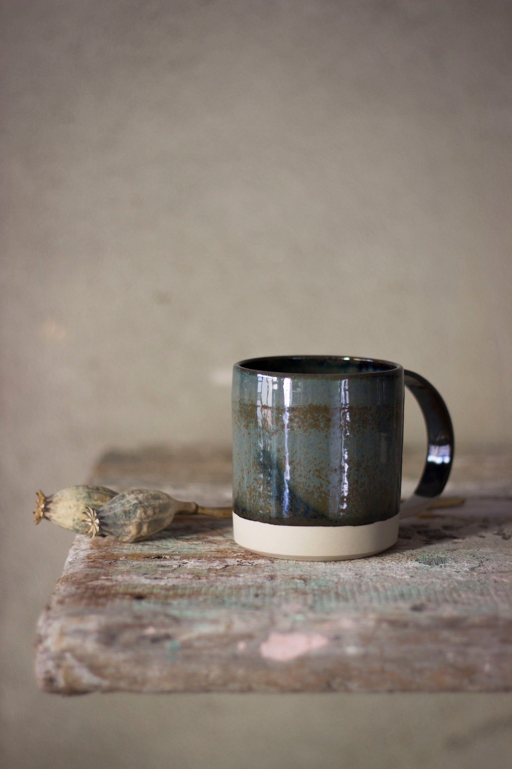 Realizzata al tornio con un gres color crema e rifinita con uno smalto grigio-azzurro lucido. Ideale per tisane, infusi o una capiente tazza di caffè per iniziare la giornata con la giusta grinta.