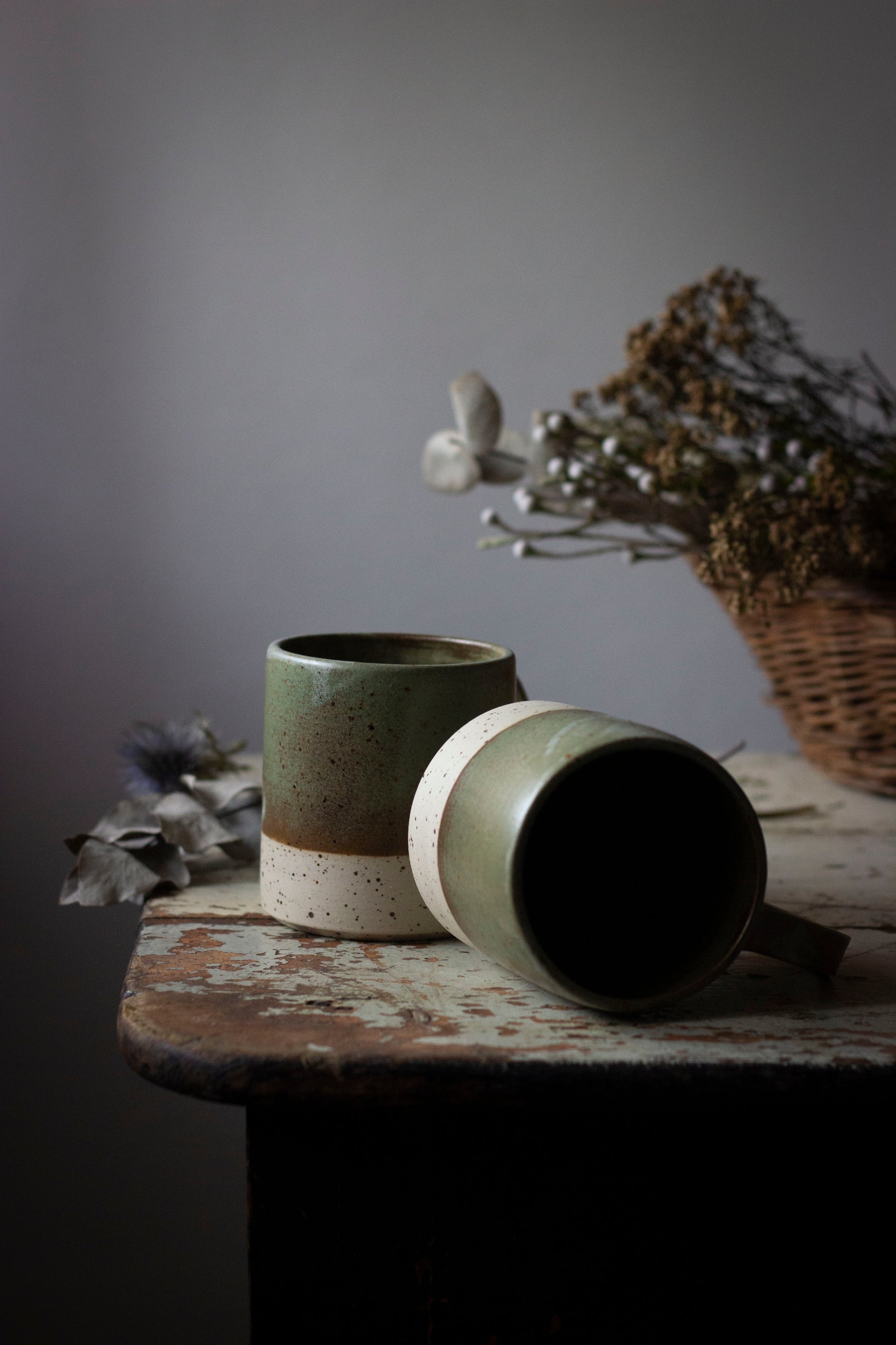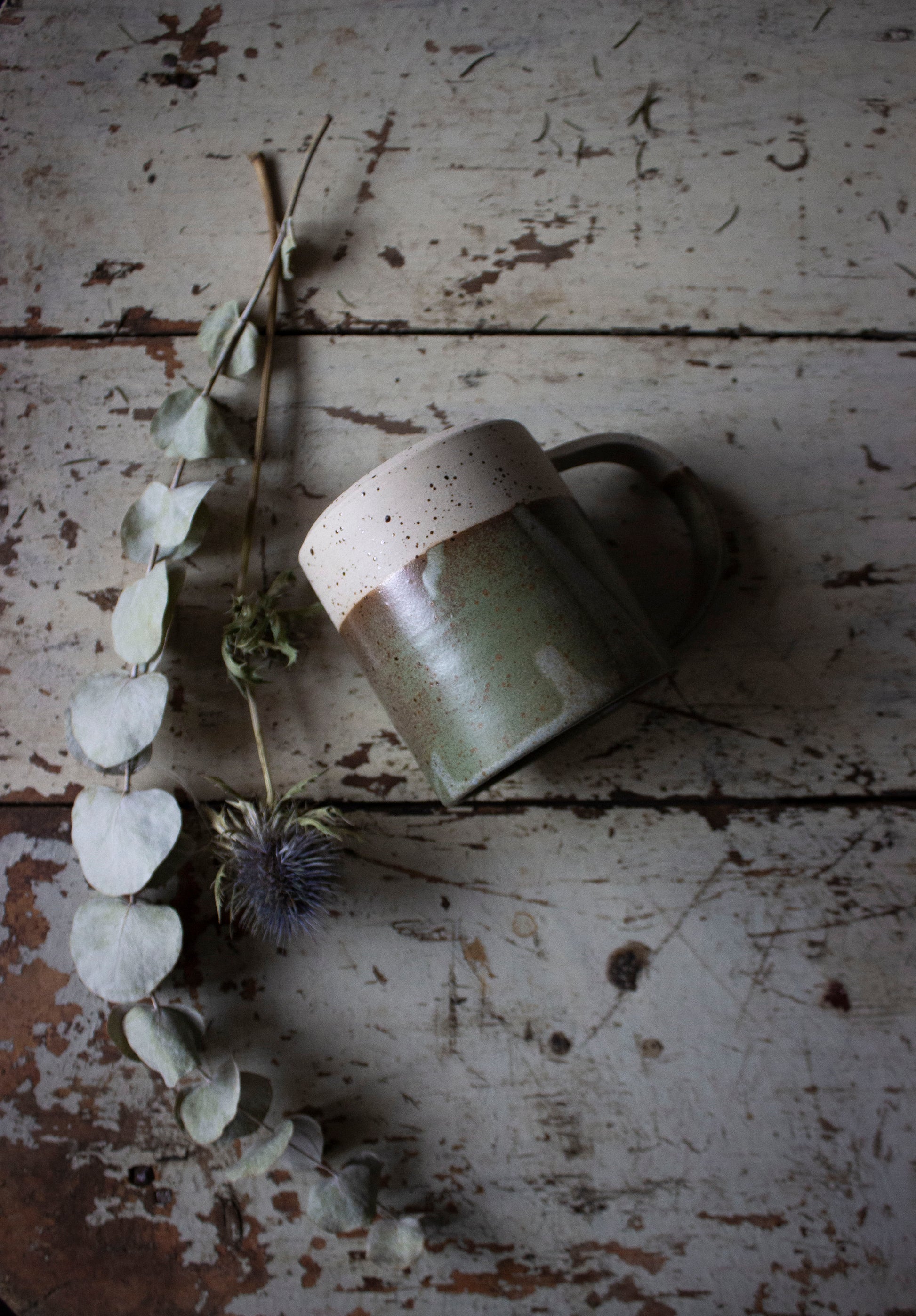 Realizzata al tornio con un gres puntinato e rifinita con uno smalto verde-grigio opaco. Ideale per tisane, infusi o una capiente tazza di caffè per iniziare la giornata con la giusta grinta.