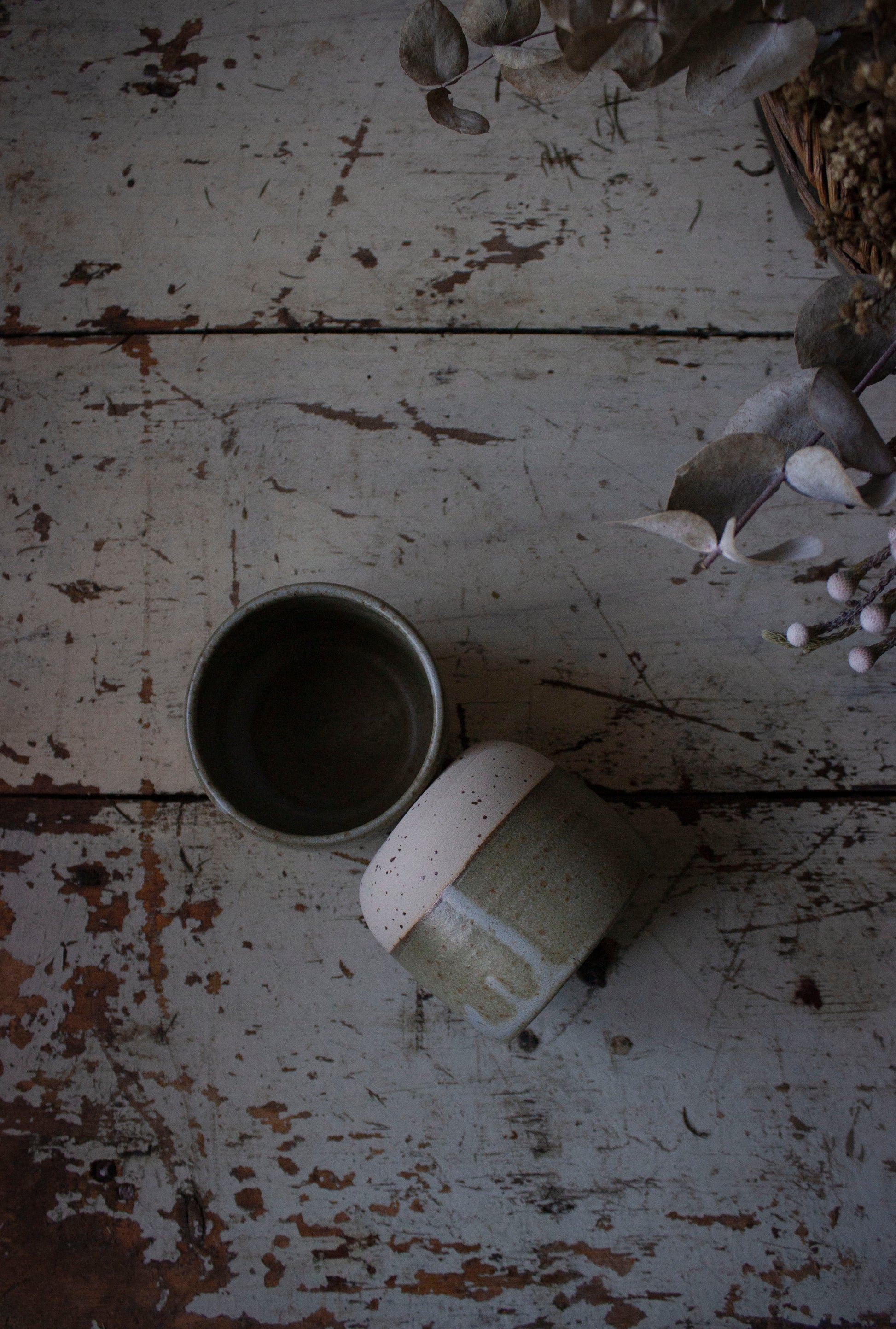 Realizzata al tornio con un’argilla color crema puntinata e rifinita con uno smalto verde pastello. L’assenza del manico la rende ideale per una calda tazza di tè o caffè nelle fredde giornate invernali.
